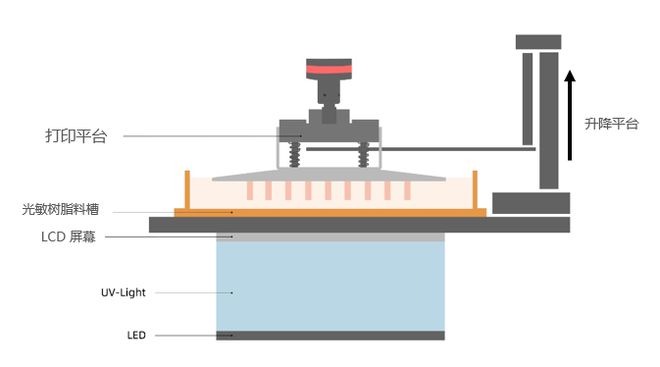 首先,3D模型會被3D打印軟件橫向地切成一層層,然后投影機(jī)會把第一層模型的形狀圖案投射到液態(tài)光敏樹脂上,然后進(jìn)行光固化及成型。第一層完成后,便會將物件稍微升高,然后投射下一層模型的形狀圖案到光敏樹脂上,層疊式地打印出模型。