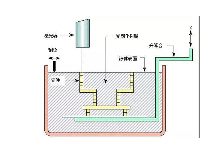 打印之前在樹脂槽中盛滿液態(tài)光敏樹脂,可升降工作臺處于液面下一個截面層厚的高度,聚焦后的激光束在計(jì)算機(jī)控制下沿液面進(jìn)行掃描,被掃描的區(qū)域樹脂固化,從而得到該截面的一層樹脂薄片;升降工作臺下降一個層厚距離,液體樹脂再次暴露在光線下,再次掃描固化,如此重復(fù),直到整個產(chǎn)品成型;升降臺升出液體樹脂表面,取出工件,進(jìn)行相關(guān)后處理,通過強(qiáng)光、電鍍、噴漆或著色等處理得到需要的最終產(chǎn)品。